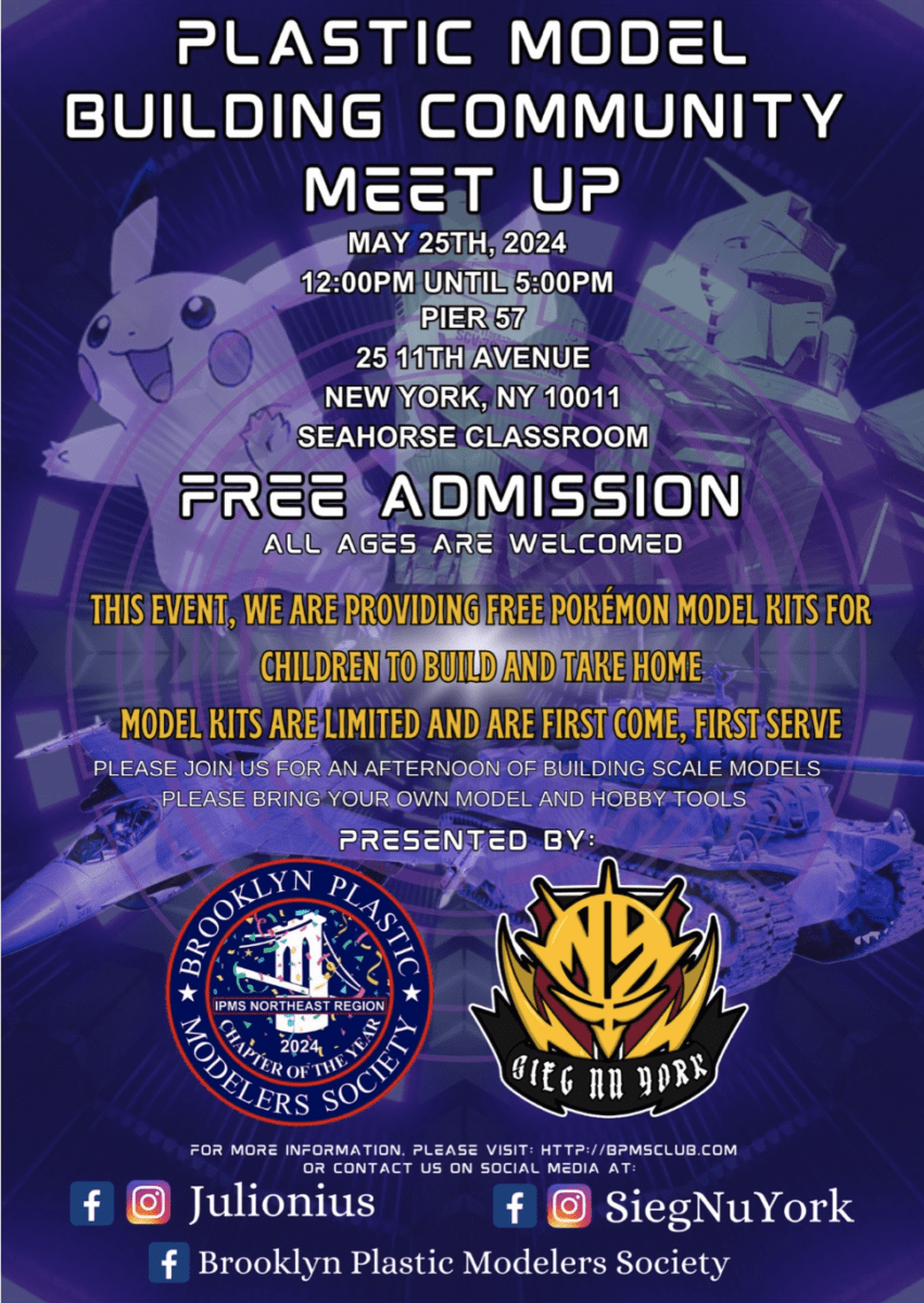 Please join the Brooklyn chapter of the International Plastic Modelers Society and the Gundam plastic model group Sieg Nu York for a day of model building and hanging out. During this event, all are welcome to stop by and hang out with talents scale modelers of all ages as we build models, converse while enjoying each others company and display some already completed models.