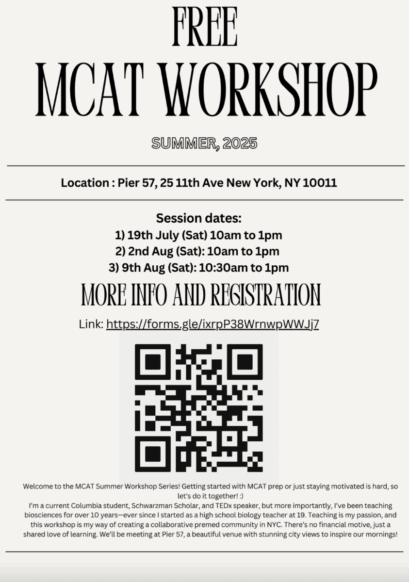 I’m a current Columbia student, Schwarzman Scholar, and TED speaker, but more importantly, l’ve been teaching biosciences for over 10 years -ever since I started as a high school biology teacher at 19. Teaching is my passion, and this workshop is my way of creating a collaborative premed community in NYC. There’s no financial motive, just a shared love of learning. We’ll be meeting at Pier 57, a beautiful venue with stunning city views to inspire our mornings!