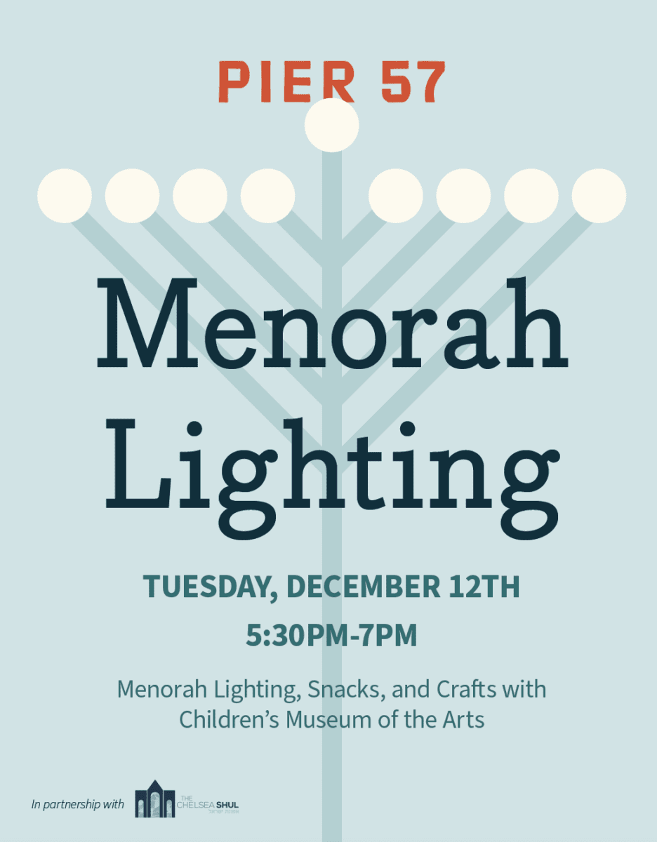 Join us to celebrate Hanukkah with a Menorah lighting in partnership with The Chelsea Shul. The night will consist of a menorah lighting, snacks, and crafts with Children’s Museum of the Arts.