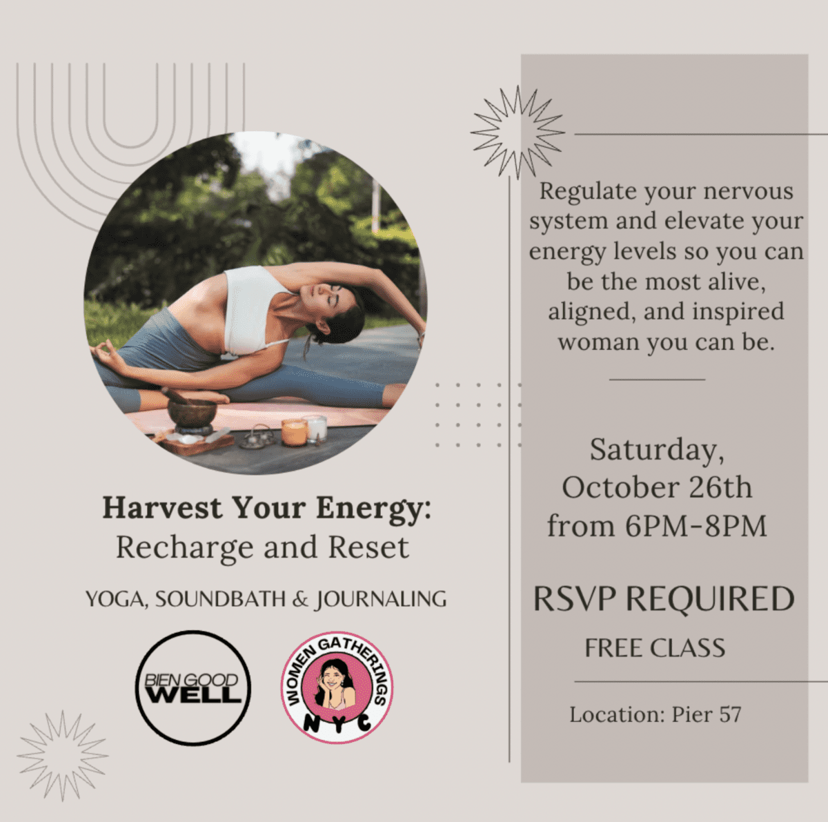 Join NYC Women Gatherings and Bien Goof WELL, as we take a moment to ground, recharge, and refocus. This afternoon is about releasing the old and stepping into the season ahead with clarity and connection. Regulate your nervous system and elevate your energy, so you can feel the most alive, aligned, and inspired woman you can be.